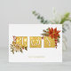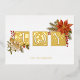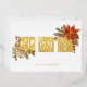 Elegant "Joy" greeting in ornate gold foil illuminated Mediaeval letters embellished with clusters of colourful red and white poinsettias, evergreens and holly with gold highlights. Includes photo template and editable text fields.