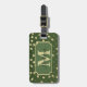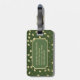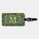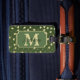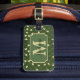 This luggage tag features your monogram in light gold, and your last name in dark green written across the top of the monogram. The monogram and text are placed on a green banner which is lined in matching gold. The background is a pattern of gold shamrocks randomly scattered across a green background. The back of the tag has the same shamrock pattern, with your customised text in light gold on the same banner. Show your Irish side!