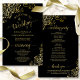 These wedding programs are elegant and tasteful, while still being budget friendly. The design features ornate golden faux foil lace with gold text on a classic black background. The typography features lacy script calligraphy, and there is room for details on the ceremony, the bridal party, and a short thank you.