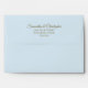This beautiful wedding envelope is features a pale powder blue coloured background with gold floral curls and swirls on the inside flap. There is a printed return address on the back flap in fancy script lettering. The design is understated and simple, yet classic, chic and ornate. Perfect way to make your wedding invitations all the more special.