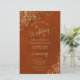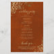 These wedding programs are elegant and tasteful, while still being budget friendly. The design features ornate golden faux foil lace with gold text on a marbled rust orange or burnt umber colored background. The typography features lacy script calligraphy, and there is room for details on the ceremony, the bridal party, and a short thank you.