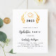 White background. A classic faux gold laurel wreath and a graduation cap. Personalise and add the year, name and details. Black text.