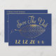 Elegant gold leaf graphic art save the date postcard. Send a message to your family and friends to save the date for your wedding, anniversary, birthday, retirement or other party. Design features a blue background with gold text.