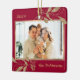 Modern Elegant Calligraphy Red and Gold Family Photo Collage Merry Christmas Script Ceramic Ornament. This festive photo holiday Ornament features a pretty faux gold botanical gold leaves with berries, family name and year in gold on red colour background. Cute nice keepsake for your family and friends in Christmas Holiday season.