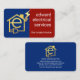 Overleaf, in a blue cover, the gold "letter-e electrician" logo you can use is at the top. This is followed by your prestigious name, the contact details and a slogan option to publicize your services.