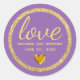 The wedding favour stickers begin with a deep purple. A round circle of gold glitter forms a frame around the edge. Inside the gold glitter frame, love is written in large letters in a modern font. The bride and groom names and their wedding date are below the word love. A gold heart is below the text.