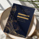 An elegant night-time coastal wedding design featuring a luminous gold lighthouse illustration set against a deep navy backdrop. Flowing ocean waves, celestial accents, and refined metallic linework create a dramatic, high-end atmosphere inspired by seaside evenings and maritime romance.