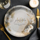 This unique paper plate is part of a sophisticated fiftieth anniversary collection. The design features soft watercolor tones of beige and charcoal, highlighted with shimmering gold accents and delicate floral line art. Bold typography balances beautifully with graceful script details, creating a sophisticated and romantic look. Perfect for celebrating '50 years of love' in timeless style. Search ID1169 to see other products in this design set.