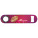 This fashionable bottle opener features a fuchsia tiger striped background with gold lipstick print.  Next to the lips is a place to customise your name however you choose.  Place your order today!