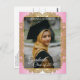 Unique and trendy congratulations graduate announcement and celebration party invitation card, with a classic faux shiny gold coloured mandala circle on a candy pink and white ombre gradient pattern background. With room to customise or personalise with a photo, the name of the graduate, class graduation year, high school and future college or university name. Let the family, friends and neighbours know there is a happy graduate ready to conquer the world, and invite everybody to come celebrate the happy event with you!