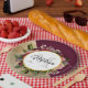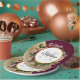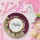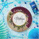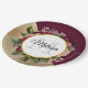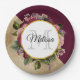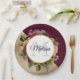 Paper plate with a golden marble pattern with a solid burgundy colour layered diagonally together. A circle with a faux gold foil border overlays a pretty floral bouquet with roses, carnations and other flowers. Personalise with your name and monogram inside the circle.