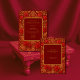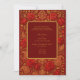 This oriental luxurious wedding invitation features a vibrant maroon red backdrop adorned with intricate gold Paisley and mango motifs and blooming rose designs, perfectly symbolising love, prosperity, and elegance. The ornate patterns and warm tones create a festive and romantic atmosphere for an indian Hindu wedding.