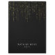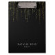 Chic black clipboard features two lines of custom text in classic white lettering, on a rich black background with vertical strands of faux gold foil string lights cascading from the top. Design repeats on reverse side.