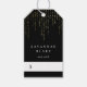 Chic hang tags for your boutique or retail business feature classic white lettering on a rich black background with vertical strands of faux gold foil string lights cascading from the top. Personalise with two lines of custom text. White space provided to write in your prices. Adjust the currency symbol as needed using the template. Backs are solid white for your additional custom text or handwritten message.