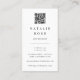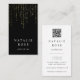 Simple and elegant vertical business card design features classic white lettering on a rich black background with cascades of faux gold foil string lights at the top. Personalise with two lines of custom text on the front, and add your full contact information to the reverse side, along with a customisable QR code.