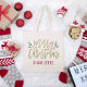 Spread holiday cheer with this festive tote featuring "Merry Christmas" in elegant gold brush calligraphy accented by holly berry sprigs and a personalized name in classic red lettering. A beautiful seasonal accessory for holiday shopping, Christmas parties, or as a thoughtful gift. Name is fully customizable.