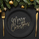 Merry Christmas text in chic fancy lettering in gold faux foil is featured on black holiday paper plates in two sizes. MATCHING items in our store.