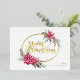 Sprays of elegant watercolor style poinsettias and berries with winter pine and greenery with oval gold foil band and custom "Merry Christmas" font with gold sparkles.