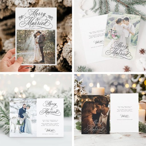 Elegant and romantic swirly calligraphy "Merry & Married" script with your names and year. For more advanced customisation of this design, please click the BLUE DESIGN TOOL BUTTON above!