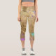 Modern and trendy Capri leggings design featuring a faux gold metallic and glitter background with purple, pink and teal paint splatters.