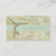 This is a really pretty business card for a gymnastics instructor or gym. It features a gold, mint green, and white abstract marbled background, with a matching light green name banner. The banner is thinly lined in shiny gold. Your custom text is in gold, also. A darker gold gymnast strikes a pose on the left side of the front. The back of the card has the same background, with a field for your information in grey. Striking!