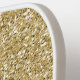 Gold and white pickleball paddle with a large modern initial monogram and personalised name and contact information or custom text in a minimalist stripe design on faux silver glitter pattern background.