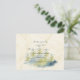 A gorgeous wedding invitation response card with a gold marble backdrop and green and blue spruce trees in the foreground.