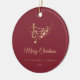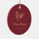 This musical Christmas ornament features a wavy stave with music notes and a treble clef in faux gold on a red background, accompanied by "Merry Christmas" in elegant script typography. Ideal for professional music ensembles, singers, choirs, chamber music groups, bands and orchestras . Personalize it with your own text, and take advantage of the editing tool to fine-tune the font size and placement.