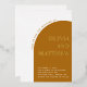 Gold modern typography arch wedding invitation and details on back side in shades of Mustard Brown, Light Brown, Bourbon, Pumpkin Skin colours. Suitable for fall / autumn wedding.