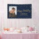 This birthday banner design features stylish gold confetti and "Happy Birthday" typography on a navy blue background. This event banner is the perfect decoration for a modern birthday celebration. You can customise the photo and the text. More banner designs available at my shop BaraBomDesign.