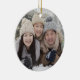This festive double-sided ornament features a full photo and fun lettering. The front features a full family photo. On the back, charcoal grey lettering reads "Season's Greetings" with your name and holiday year below. The typography design is framed by a gold wreath against a white background.