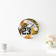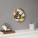 This wild zebra stripes girl's volleyball wall clock features a bold zebra stripes accent pattern on four of the volleyball's panels - the zebra stripes panels plus three other panels have an orange/gold background that contrasts with the remaining white volleyball panels - customise with player name and jersey number - by katz_d_zynes
