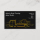 Stylised gold outline of a rollback wrecker with a loaded extended cab pickup truck. This towing business card could be used by repair shops, auto insurance, or body shop repair.