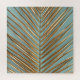 Closeup view of gold painted natural tropical date palm leaf on light muted cyan blue background. Decorative diagonal geometrical floral pattern design.