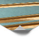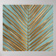 Closeup view of gold painted natural tropical date palm leaf on light muted cyan blue background. Decorative diagonal geometrical floral pattern design.