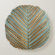 Closeup view of gold painted natural tropical date palm leaf on light muted cyan blue background. Decorative diagonal geometrical floral pattern design.