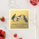 Gold and Blue Peacocks Romantic Wedding Paper Napkins. BlissfulWedding © at Zazzle. Two beautiful peacocks on vintage banner and text in a dark blue font all on a gold foil background (printed photo effect) with monogram initials, bride and groom first names and wedding date, create a unique, stylish napkins for the wedding reception or wedding shower. Other colours available.
