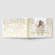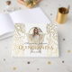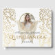 Classy, elegant, unique, gold transparent butterfly in front side in combination with custom photo of the girl and fancy gold foil floral swirls.