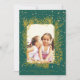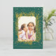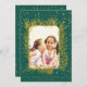 Gold pine frame with photo and gold confetti evergreen green Christmas holiday card. A lovely design that includes a gold pine frame with cone and needles, gold confetti borders and your photo on green background. The back is covered with a gold confetti. Change photo and text to fit your needs.