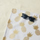 A tropical pattern of pineapples covered in a shiny gold texture. The pineapples are placed on a very light grey background. They are drawn with a mosaic technique for a modern look. This print has all the feelings of a tropical resort, but the subtle gold look gives it a classy, chic feel.