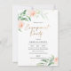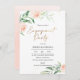 Delicate pink floral and greenery or foliage engagement invitation with a faux gold foil modern calligraphy heading and watercolor wash back ground on the back of the invite.