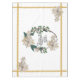 This pretty white tablecloth with gold trim on four sides features a wreath of gold and white poinsettia flowers, golden berries, and greenery. Black text in the centre of the wreath reads The Most Wonderful Time of the Year!