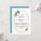 Gold foil polygon and seashells summer beach wedding bridal shower invitation. It features a gold polygonal frame with your text and three watercolor seashels in beige and blue on the upper left corner and another one at the left bottom. The back is of solid blue colour.