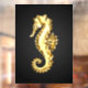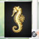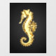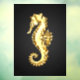 Artistic, polygonal, seahorse of sparkling, gold foil on black background.
