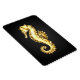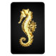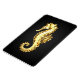 Artistic, polygonal, seahorse of sparkling, gold foil on black background.