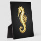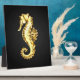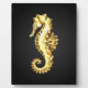 Artistic, polygonal, seahorse of sparkling, gold foil on black background.