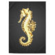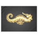 Artistic, polygonal, seahorse of sparkling, gold foil on black background.
