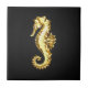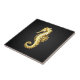 Artistic, polygonal, seahorse of sparkling, gold foil on black background.