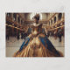 Standing in a vintage grand hall or perhaps a vintage train station, slightly out of place, this Victorian steampunk Gold Princess shines in blue and gold with clockwork gears woven into her elegant fantasy dress with unique postcard.