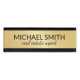 This name tag features name in black modern sans serif font style and title in black modern script font style on gold background.
